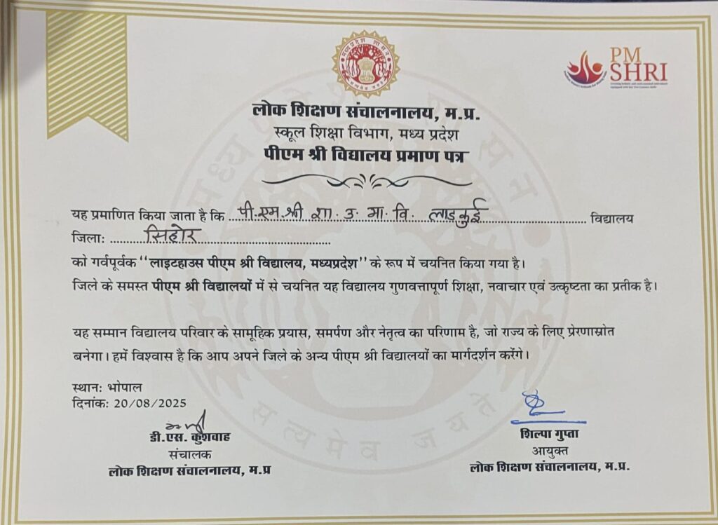 वही शिक्षा के क्षेत्र में उत्कृष्ट कार्य नवाचार और नई शिक्षा नीति 2020 के सफल क्रियान्वयन के लिए सीहोर जिले की भैरुंदा तहसील के शासकीय उच्चतर माध्यमिक विद्यालय लाड़कुई को लाइटहाउस पीएम-श्री स्कूल के रूप में चुना गया है। यह उपलब्धि जिले के लिए एक बड़े गौरव की बात है। क्योंकि पूरे देश के 664 एवं प्रदेश लगभग 700 स्कूलो मे से ऐसे 52 स्कूल व जिले के सर्वश्रेष्ठ पीएम-श्री स्कूलों में से लाड़कुई स्कूल को लाइटहाउस स्कूल के लिए चुना गया हैं।