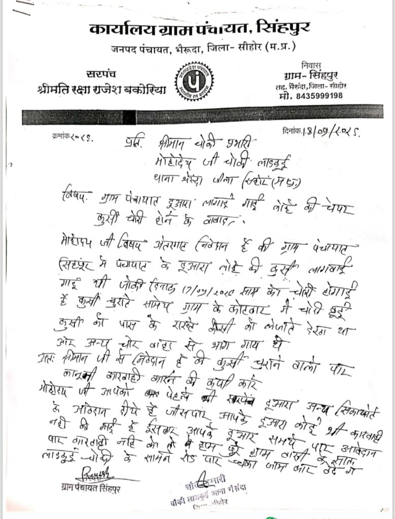वही ग्राम सिंहपुर में लगातार चोरियों की वारदात को लेकर ग्राम सरपंच प्रतिनिधि के साथ ग्रामीण लाड़कुई चौकी पहुंचे और आवेदन देकर कार्यवाही की मांग की, इस दौरान सरपंच प्रतिनिधि राजेश बकोरिया ने बताया कि अगर पुलिस द्वारा जल्द कोई कार्यवाही नहीं की जाती है, तो लाड़कुई चौकी के सामने चक्का जाम किया जाएगा।