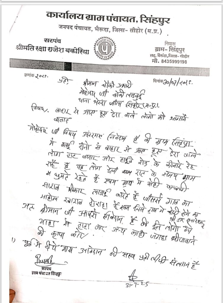वही राजेश बकोरिया ने बताया कि कुछ दिन पूर्व ग्राम सिंहपुर मे बाहर से आए लोगो रोड़ किनारे डेरा डालकर रह रहे है, इनके आने के बाद से ग्राम मे चोरी की घटना बड़ गई है, वही ग्राम पंचायत द्वारा ग्राम के कुछ स्थानो पर कुर्सीया लगाई गई थी, जो चोरी हो गई। साथ ही राजेश ने यह भी बताया कि हमारे द्वारा पूर्व मे भी कई बार लाड़कुई चौकी मे कार्यवाही हेतु आवेदन दिया गया, लेकिन लाड़कुई चौकी द्वारा कोई कार्यवाही नही की जा रही है।