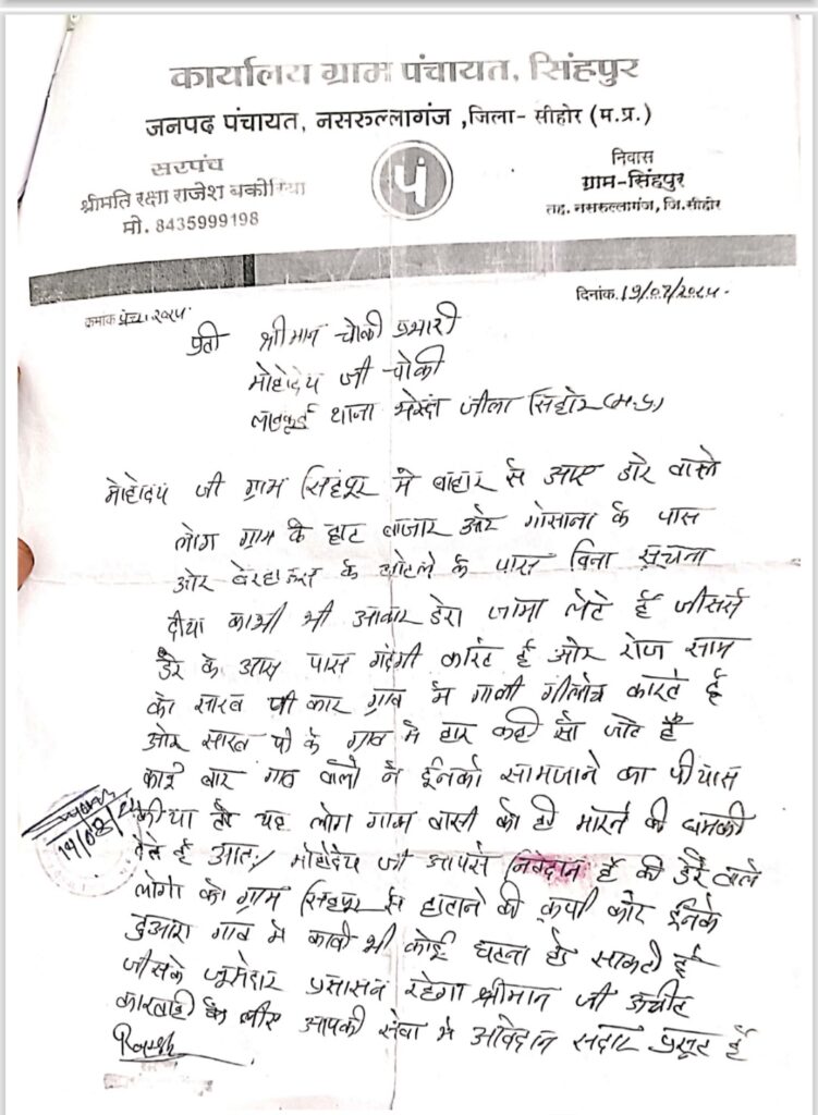 बता दे कि कुछ दिन पूर्व बाहर से आए लोगो द्वारा डेरा डालकर ग्राम के वन क्षेत्र मे रह रहे है, जिसके कारण आए दिन लोगो के साथ अभ्रद व्यवहार ओर शराब पीकर रात मे ग्रामीण के साथ मारपीट व गाली गलौज करते है, वही ग्रामीण द्वारा ग्राम मे चोरी की वारदात मे बढ़ोत्तरी होने की बात भी कही है, जिसको लेकर ग्रामीण व सरपंच प्रतिनिधि राजेश बकोरिया ग्राम लाड़कुई चौकी पहुंचे ओर आवेदन देकर उक्त लोगो पर कार्यवाही की बात कही।