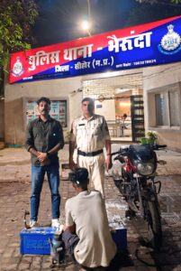 वही अपराध पंजीबद्ध कर थाना प्रभारी भेरूंदा द्वारा टीम गठित की गई, गठित टीम द्वारा तकनीकी सहायता व मुखबिर तंत्र को सक्रिय कर संदेही धीरज भल्लावी पिता ओमंप्रकाश भल्लावी जाति गौंड उम्र 21 साल निवासी वार्ड क्रमांक 11 बजरंग कुटी भैरुंदा को हिरासत मे लेकर पूछताछ की, जिसने अपना जुर्म स्वीकार करते हुए उक्त चोरी गई दो बेट्री व एक जैक चोरी करना स्वीकार किया, जो आरोपी के कब्जे से बरामद कर घटना मेें प्रयुक्त मोटर साइकल कीमत करीबन 75 हजार का माल/मशरुका ज़प्त किया गया।