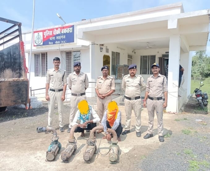 जिस पर मामले को संज्ञान में लेते हुए शाहगंज थाना प्रभारी पंकज वाडेकर के कुशल नेतृत्व में एक टीम तैयार की गई जिसमें घटना को अंजाम देने वाले दो चोर अजय पाल चौधरी उर्फ छोटू पुत्र दशरथ सिंह चौधरी उम्र 19 साल राम जी उर्फ छोटू चौधरी पुत्र गुड्डू चौधरी उम्र 20 साल दोनों निवासी ग्राम चिखली थाना शाहगंज को गिरफ्तार करते हुए आरोपियों से चार मोटर पंप और घटना में उपयोग की गई मोटरसाइकिल जप्त की है।