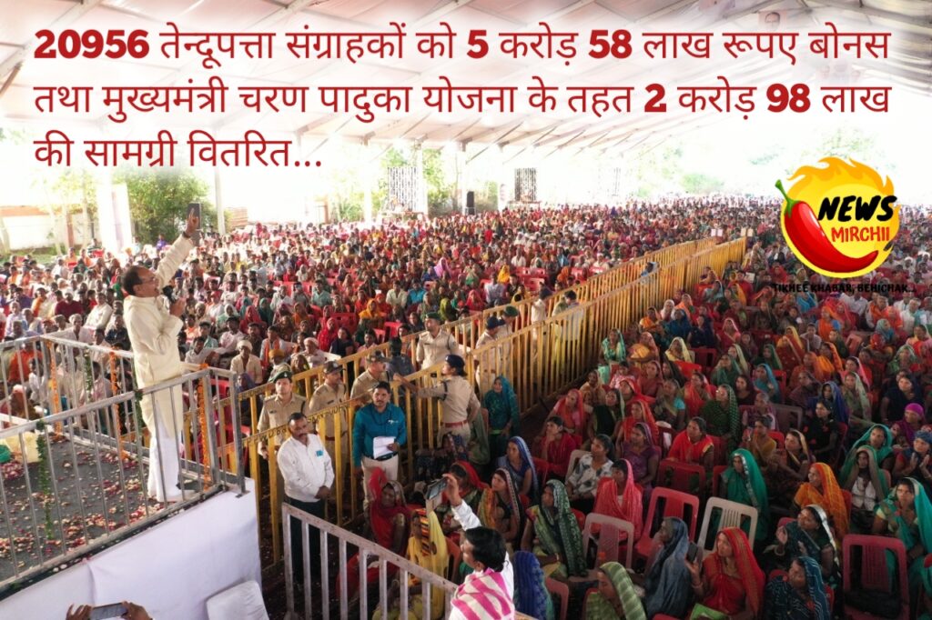 20956 तेन्दूपत्ता संग्राहकों को 5 करोड़ 58 लाख रूपए बोनस तथा मुख्यमंत्री चरण पादुका योजना के तहत 2 करोड़ 98 लाख की सामग्री वितरित की गई।