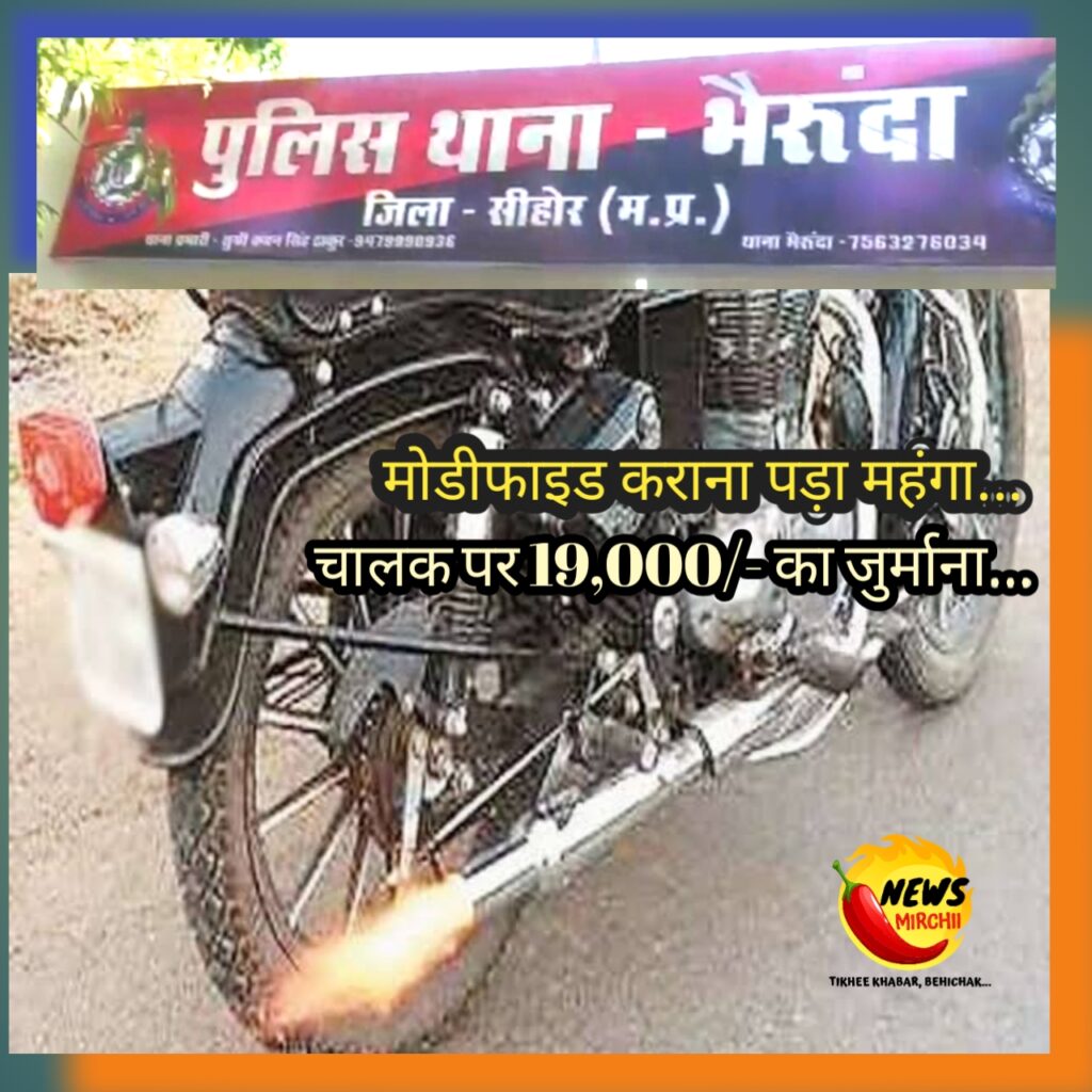 निर्देश पालन में भेरुन्दा पुलिस द्वारा दिनांक 27/9/23 को वाहन चेकिंग के दौरान बुलेट चालक दीपक विश्वकर्मा पिता प्रकाश विश्वकर्मा निवासी शास्त्री कालोनी के विरुद्ध बुलेट वाहन क्रमांक mp06/na /1692 के शायलेंसर को मोडीफाइड कर पटाखे की आवाज में वाहन चलाते व ध्वनि प्रदुषण कर आम जनता में भय उत्पन्न करने के विरुद्ध मोटर व्हीकल की पृथक -पृथक धाराओं के अंतर्गत वाहन जप्त कर इस्तगासा माननीय न्यायालय भेरुन्दा पेश किया गया।