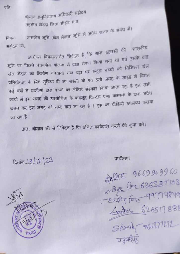 ग्रामीणों को जब इसकी जानकारी लगी तो उन्होंने मौके पर पहुंचकर इसका विरोध किया और काम रूकवा दिया। मंगलवार को इटारसी के ग्रामीणों ने एक ज्ञापन अनुविभागीय अधिकारी राजस्व मदनसिंह रघुवंशी को सौंपा। जिसमें उन्होंने बताया कि ग्राम पंचायत सरपंच व सचिव की मिली भगत से गांव के सरकारी खेल मैदान पर बिंदल कंपनी के कर्मचारियों ने पोकलेन मशीन से खुदाई कर यहां बड़ा सा गड्डा बना दिया, जो आने वाले समय में दुर्घटनाओं को आमंत्रण देगा।